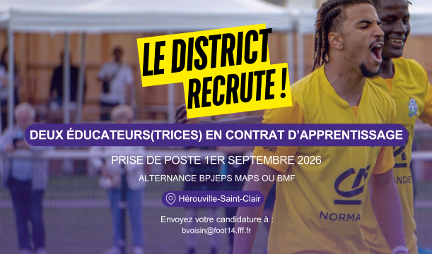 Le District du Calvados de Football, fort de plus de 25 000 licenciés et 150 clubs, recrute deux éducateu...